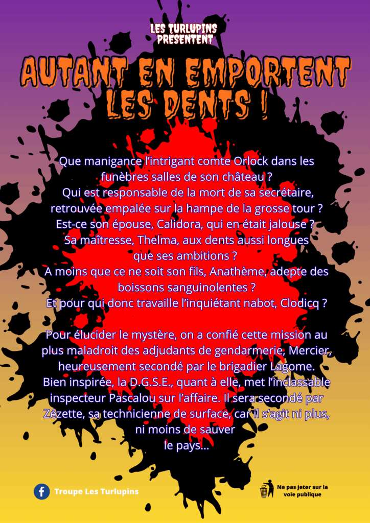 Une comédie policière déjantée où le comte Orlock, sa famille et ses suspects aux dents longues plongent les gendarmes Mercier et Lagome dans une enquête aussi sombre qu’hilarante. Un spectacle familial écrit par Philippe Valcq et mis en scène par Anthony Delcitte